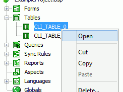 To open an existing table, right click on the table name and select Open from the popup menu. This will open the desired table in the Editor window for editing and viewing.