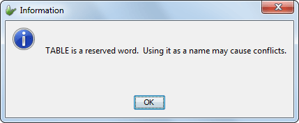 Reserved words are acceptable as table names, though it is not recommended as reserved words may create conflicts in the SQL statements used for database creation and access. The following message will be displayed when a reserved word is entered as a table name.