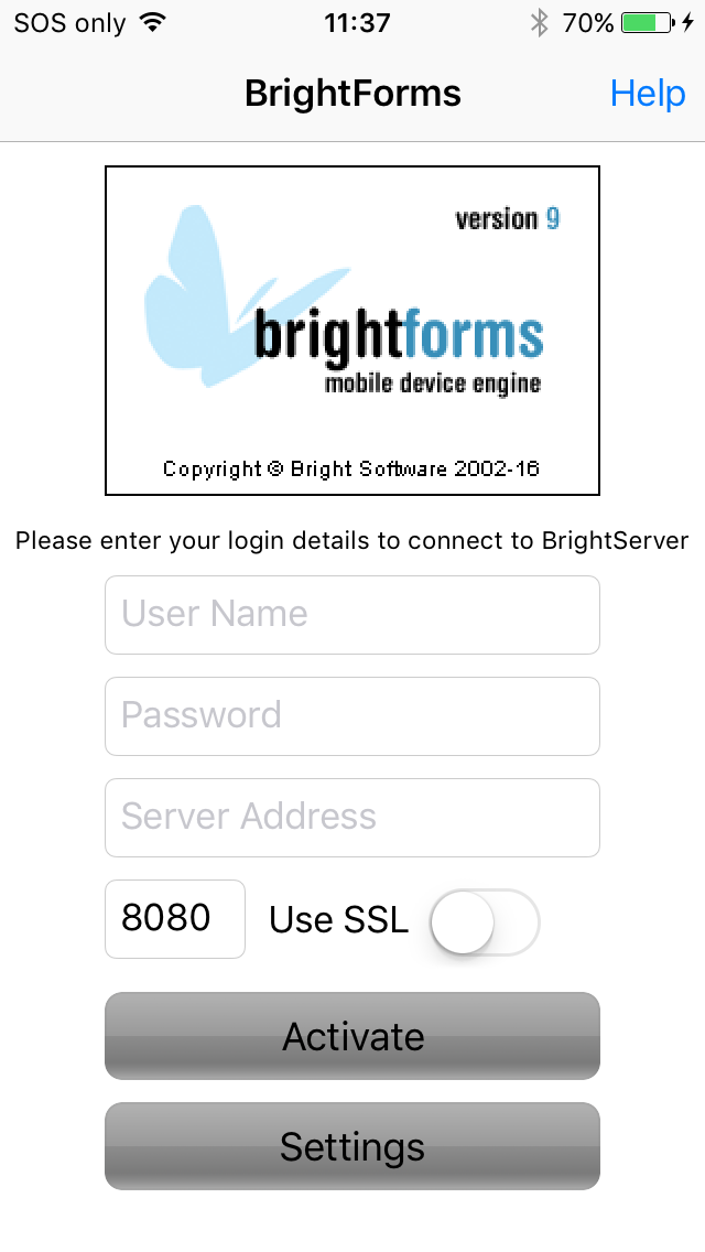Setup BrightForms to connect to BrightServer by specifying the username, password and server address/port via the initial activation page or Help > Settings dialog.