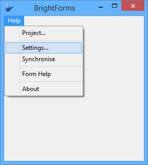 Click or tap on the Help menu to display the drop down menu for BrightForms on Windows, Windows Mobile and iOS devices. For Android, this menu my be accessed by the device's Menu button. Refer to the image below: