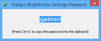 To check out the password for today, return to BrightBuilder and select Tools > Today's BrightForms Setting Password, this will display the password for today like the dialog box shown below.