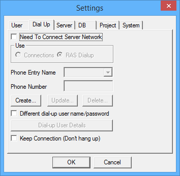 Once there is an existing RAS, you can update the dial-up settings by clicking on the Update button in the Settings>Dial Up tab. This will bring up the RAS entry form (refer to the image below), note that only the Phone, Area Code and Country Code are modifiable.