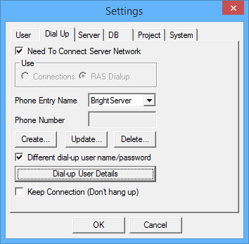 Dial up settings are specified in the Dial Up tab shown in the following image. It is only available on BrightForms on Windows devices.