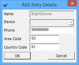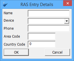 To create a dial up connection, click on the Create button and fill up the RAS Entry Details form shown below and then click OK.