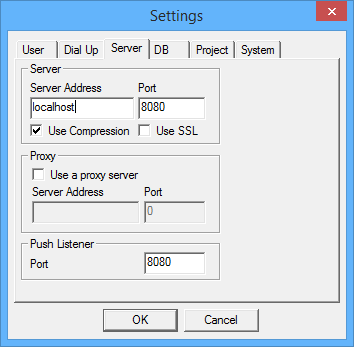 The Server tab is required for the synchronisation engine to work. BrightForms executor checks these settings to find which server to connect. Simply enter the Server IP Address and Port Number and specify Protocol attributes (i.e. SSL and/or Compression).