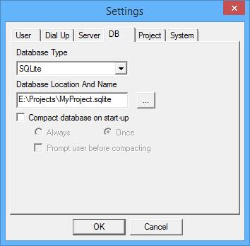 The DB tab specifies the database location, name and type to be used by the application project.