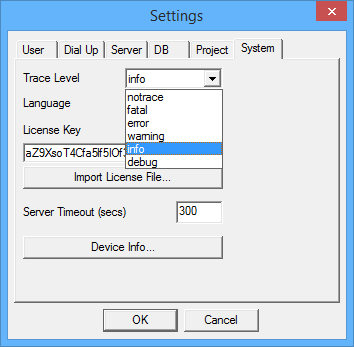 The System setting tab determines the trace module for the project. Initially, there is no trace for the project upon execution. The trace module is a convenient way to identify bugs, issues and errors related to your application. During the application development and testing, it is strongly recommended to set the trace level to Info and go through the trace file as often as possible to check any issues or problems that may occur.