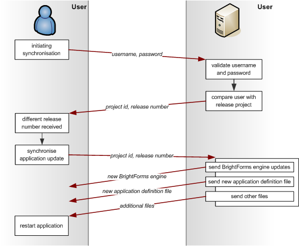 The above figure displays the data transfer protocol used by the Sync Manager. Upon connection with the server, the client sends its user name and password to access the server. The server responds with the Project Id and the Release Number the user is supposed to have on the device. The difference will trigger BrightForms to synchronise new application updates.