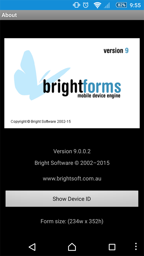 If no form has been specified in this property, this action will display the default BrightForms About form, which shows the product name, version number and company name. This is the same form which is displayed via accessing the System > Device Info option in BrightForms' settings.