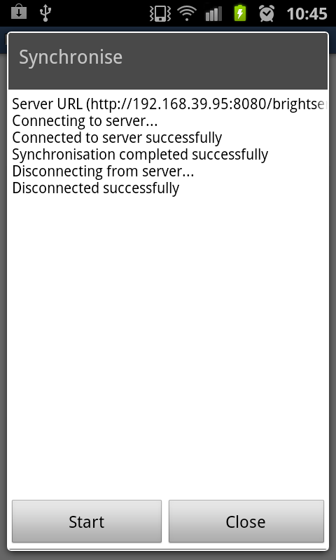 The Synchronise menu allows BrightForms to synchronise with the server using any or all the sync rules that has been enabled in the project application. It uses the server settings you entered in the Server tab to determine which IP address and port number to use.