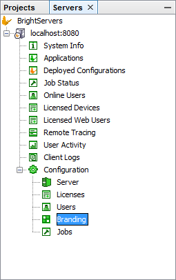 To begin branding the server, locate the 'Branding' node for the server under its 'Configuration' node and double click or select 'Open' via the context menu to open the branding editor. If necessary, download the BrightServer configuration to display the current branding configuration. Please note, that only BrightServer 7.2.0 or newer supports this feature.