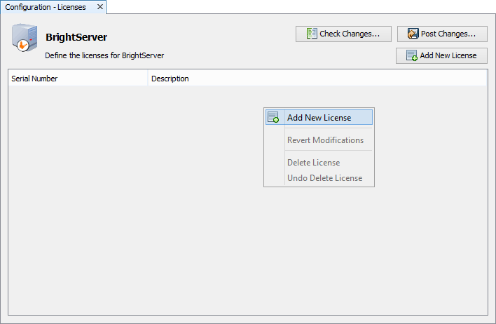 The Licenses panel allows the user to add licenses for BrightServer. To open the Licenses panel, either double click on the Licenses node or mouse right click to display the pop up menu to open and select Open menu option.