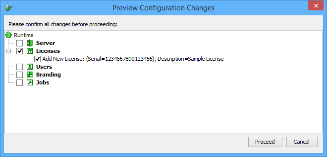 Once completed, the licenses may be verified and uploaded to the server via the 'Post Changes ...' option of the configuration node, or button on the panel.