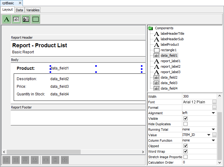 The Body section represents a single record in the query the report is on. A query which returns 50 records will have 50 body entries in the resulting report. In this section, Data Fields may be laid out to display text or image data within the record's columns.