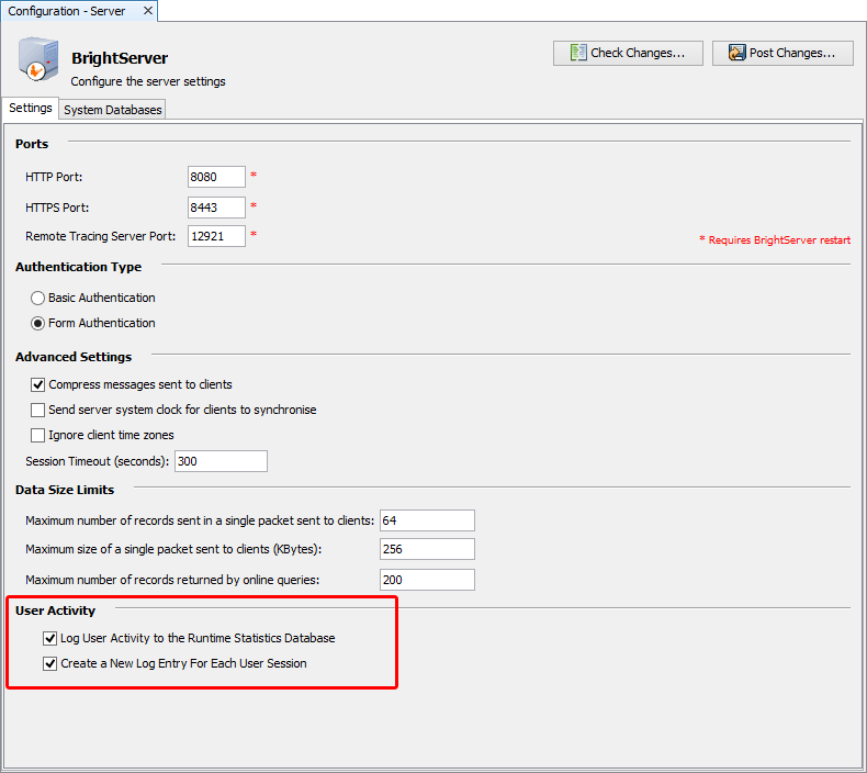 User activity logging is turned on via a BrightServer instance's Server Settings, which may be accessed after connecting and configuring the server. To activate this feature, simply enable the Log user activity to the runtime statistics database option, then upload the configuration to the server.