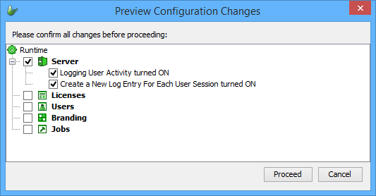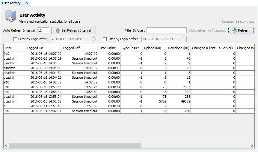 Additionally, the Create a New Log Entry For Each User Session option may be activated in conjunction with this logging. If turned on, this feature will create a new entry each time a user logs in to the server, such that a history of all user synchronisations is recorded. Turned off, only the single most recent record will be kept up to date for each user.