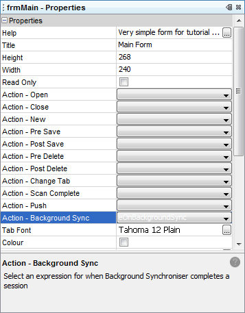 Logic responding to background sync sessions utilises the form property ‘Action – Background Sync’. As mentioned before, an expression assigned to this value will execute after Background Sync’s session, regardless of if whether server have been touched or data was actually synchronised or not.