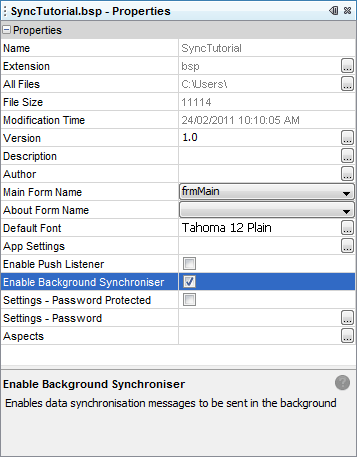 Enabling Background Synchronisation in projects is achieved by setting the ‘Enable Background Synchroniser’ property of the bsp to true. When this is done, the background sync thread in BrightForms will be active, and will run in intervals defined by the Synchroniser.SetBackgroundSyncIdleTime() method, and Synchroniser.SetBackgroundSyncRetryTime() method or sync error.